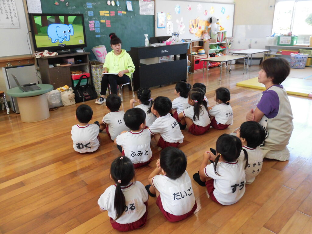 9月22日(月)今日は、英語教室「イングリッシュシャワー」の日でした。ひまわり組、ゆり組それぞれで英語の動画を見ながら動物の英語の呼び方を聞いたり、みんなで一緒に数を数えたりして英語に親しみました。外部講師の先生の発声に合わせて体も動かしながら発音する子どもたちはとても楽しそうでした。