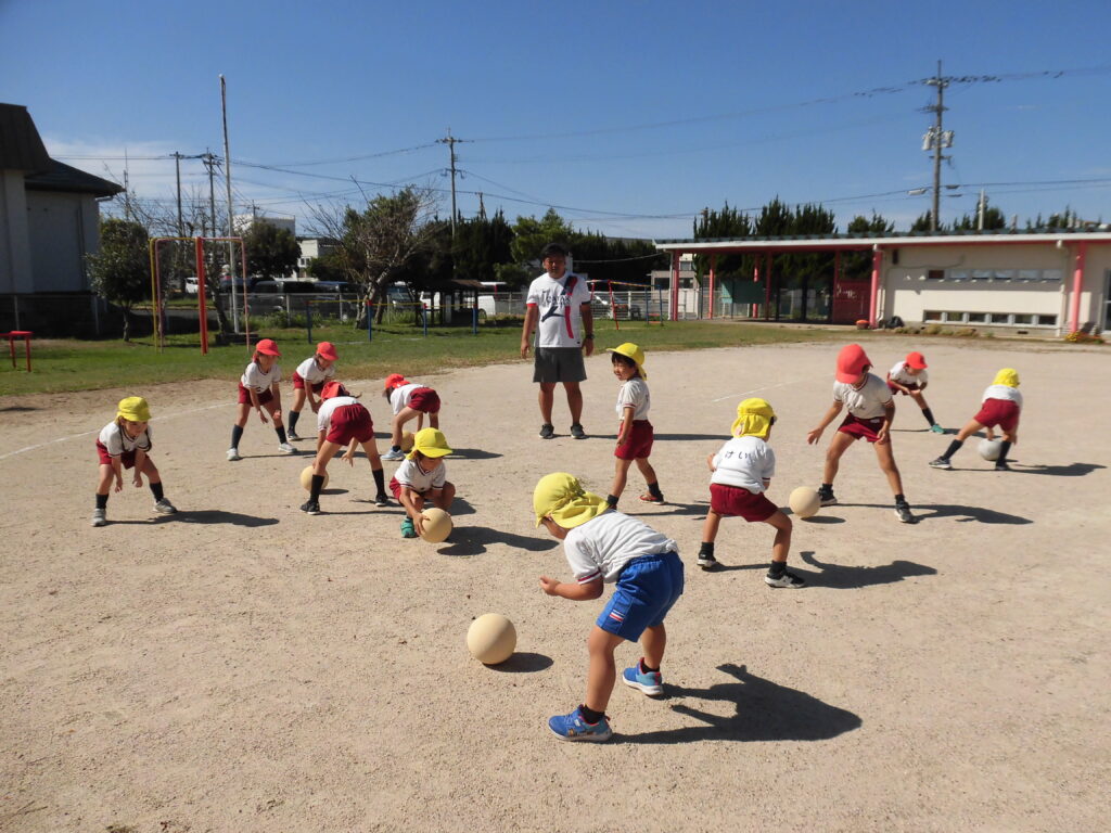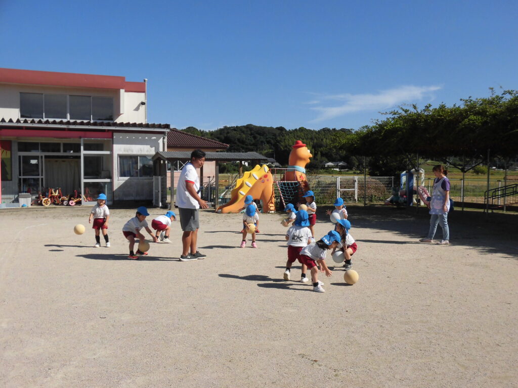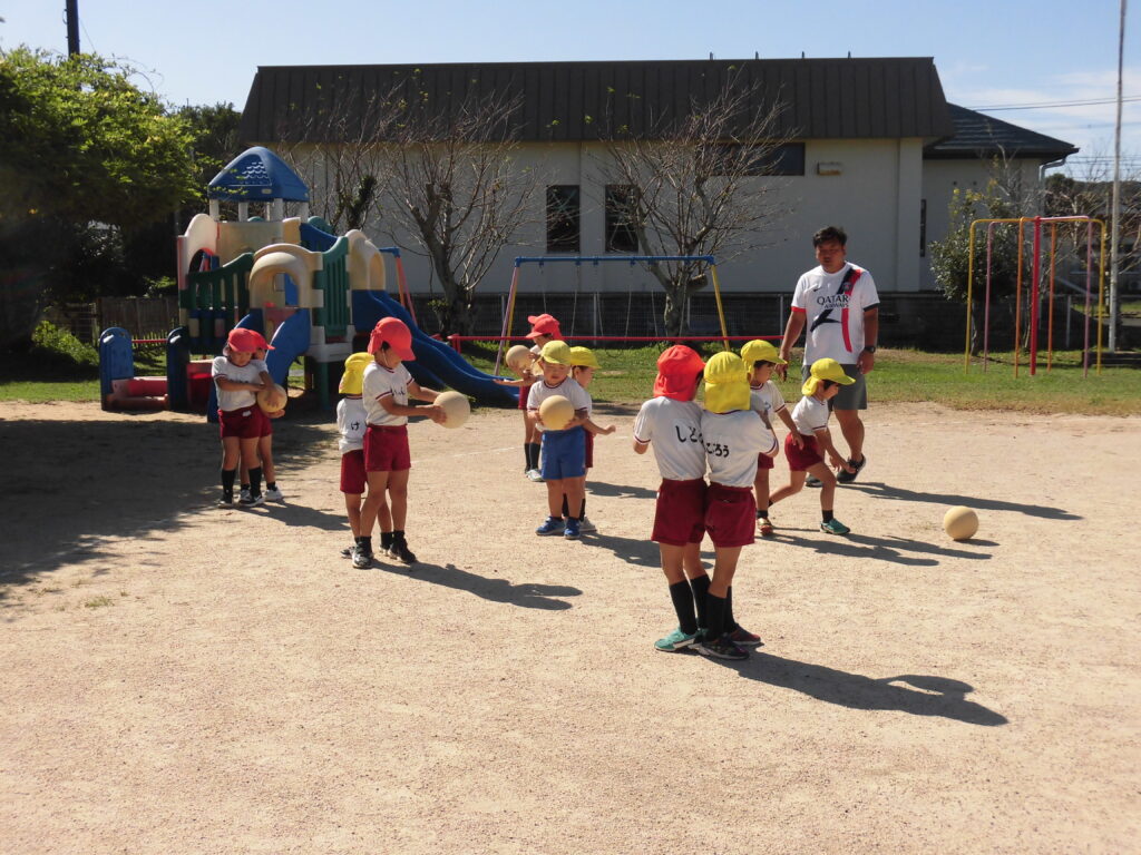 10月17日(金)今日は、いむら体育教室の日でした。年少さんと年中・年長さんに分かれて、それぞれに合ったボール遊びをして楽しみました。小さい子どもにとってボールを操るというのは難しいことです。手で扱ってもなかなかうまくコントロールできません。足となるとさらに難しくなります。ボールを操るというよりも操られるといった感じですが、何度も練習することでできるようになっていきます。手足を思うように動かせるようになるとできることもどんどん増えていきます。頑張っていろいろとチャレンジしてほしいと思います。
