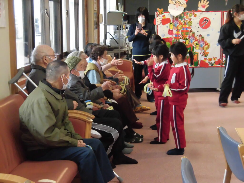 12月16日(火)今日は、社会福祉協議会のクリスマス会に年長さんが参加しました。デイサービスで来られているおじいちゃん、おばあちゃん方と楽しいひと時を過ごしました。はじめに子どもたちのダンスを見ていただいてから、一緒にゲームに答えたり、じゃんけんゲームをしたりして交流を深めました。最後は子どもたちにプレゼントをいただき大喜びでした。これからも地域の皆様と触れ合う機会を大切にしていきたいと思います。
