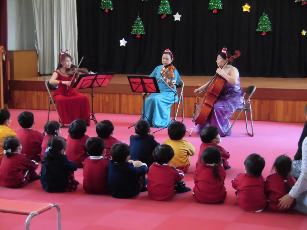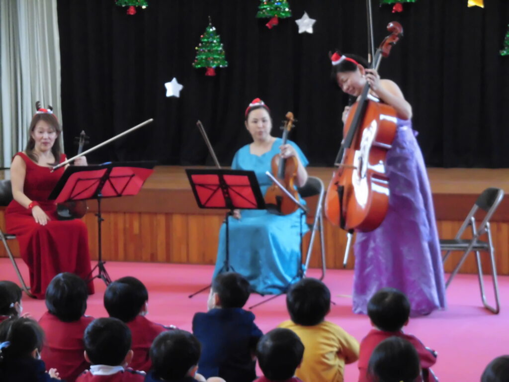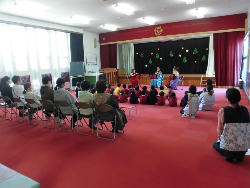 12月19日(金)今日は、田平まちづくり協議会主催の「クリスマスクラシックコンサート」をやよい幼稚園でも行っていただきました。バイオリン、ビオラ、チェロの三重奏に子どもたちも聴き入っていました。最後は「あわてんぼうのサンタクロース」の演奏に合わせて子どもたちも体を動かしながら楽しく歌いました。クラシックの生の演奏を目の前で聴くことができ、とても良い体験になりました。関係者の皆様のご厚意に感謝いたします。
