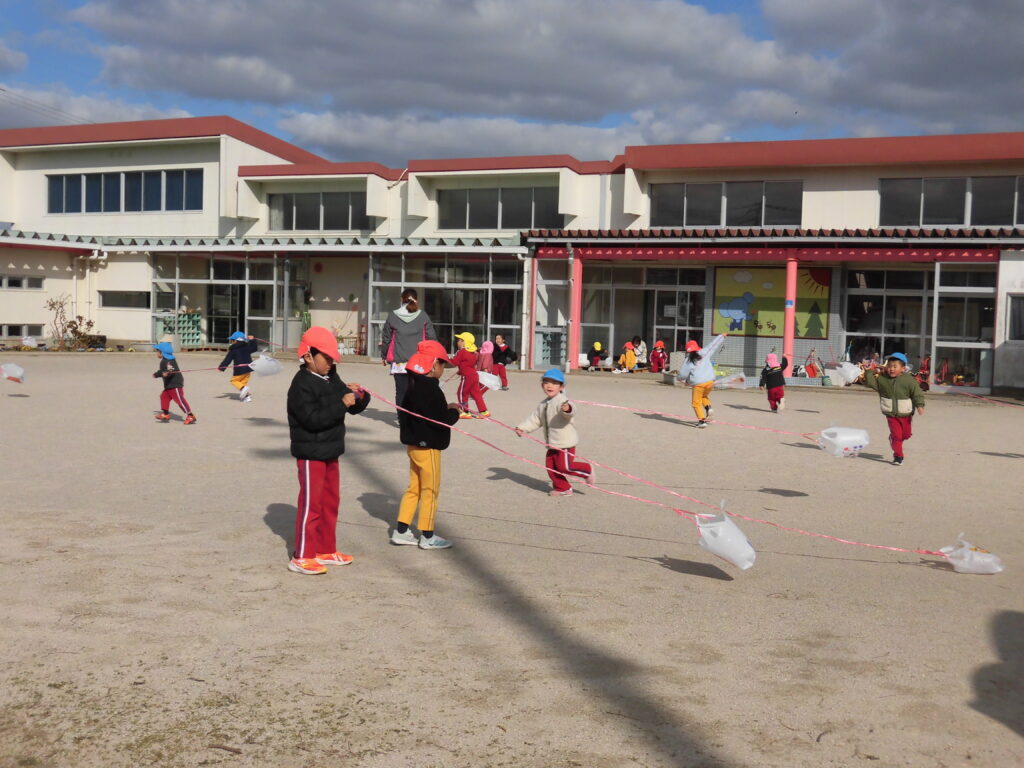 1月9日(金)今日は、自分たちで作った凧あげをして遊びました。ビニール袋を使った凧作りは、それぞれが思い思いに絵をかいたり、シールを張ったりして自分の凧をつくりました。出来上がった凧を園庭で引っ張って走る様子はそれは楽しそうでした。歓声を上げたり、友達と競争しながら走ったり、勢い余つて転んでしまう子どもがいたりと元気いっぱい楽しみました。