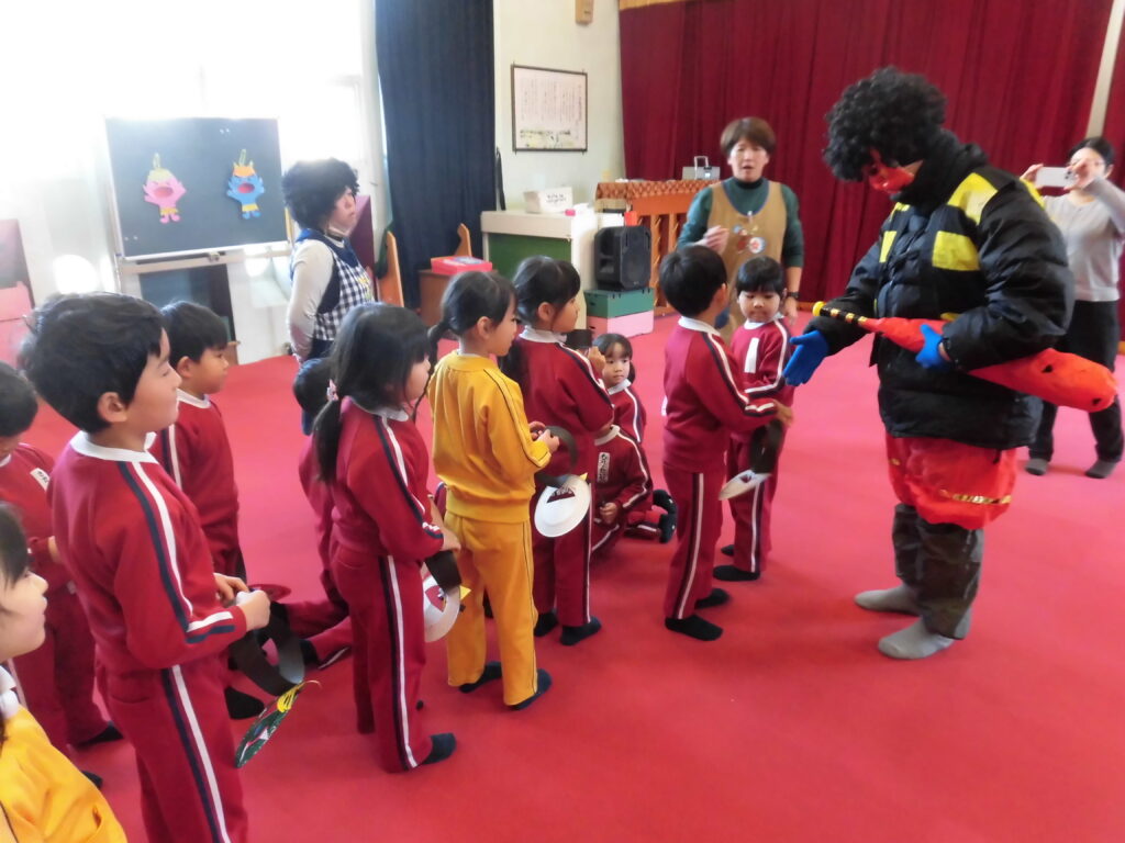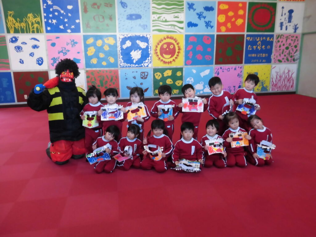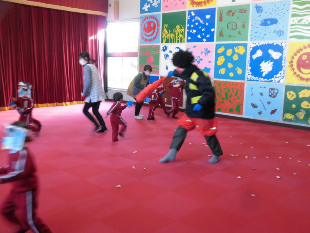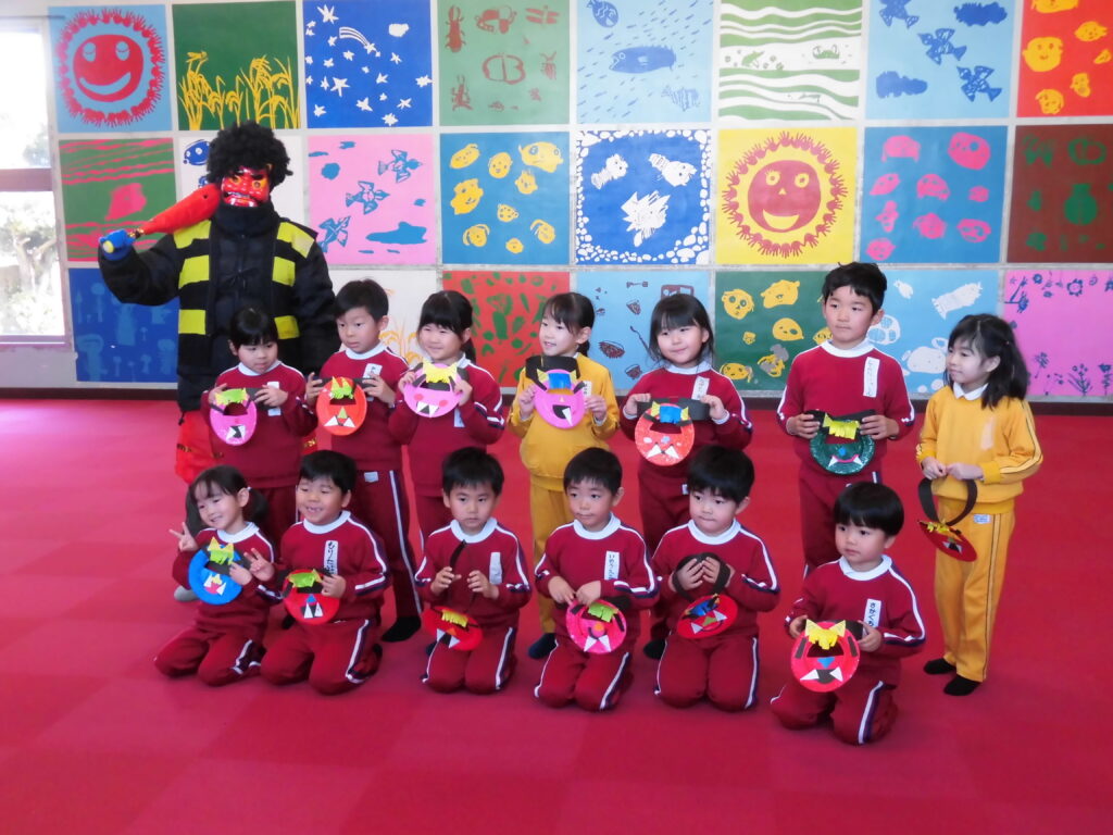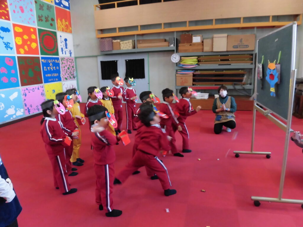 2月3日(火)今日は節分の豆まきを楽しみました。それぞれが作った鬼のお面をつけて「鬼は外!福は内!」と自分が直したい「泣き虫鬼」や「好き嫌い鬼」などを追い出しました。元気いっぱいの掛け声にひかれて鬼さん(ゲスト)登場、子どもたちはびっくりして逃げ回りましたが、最後は仲良く一緒に記念撮影、楽しい時間を過ごしました。鬼さんありがとうございました。(保護者の方は、LINEのやよい幼稚園の活動の様子で動画が見れるようにしています。)