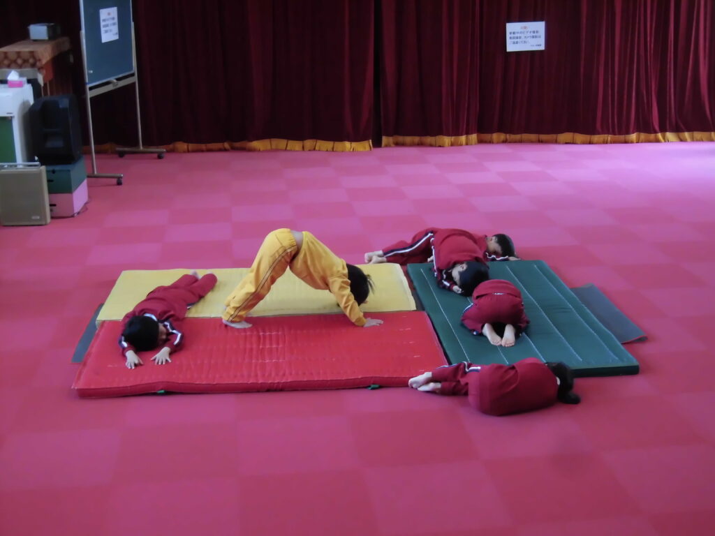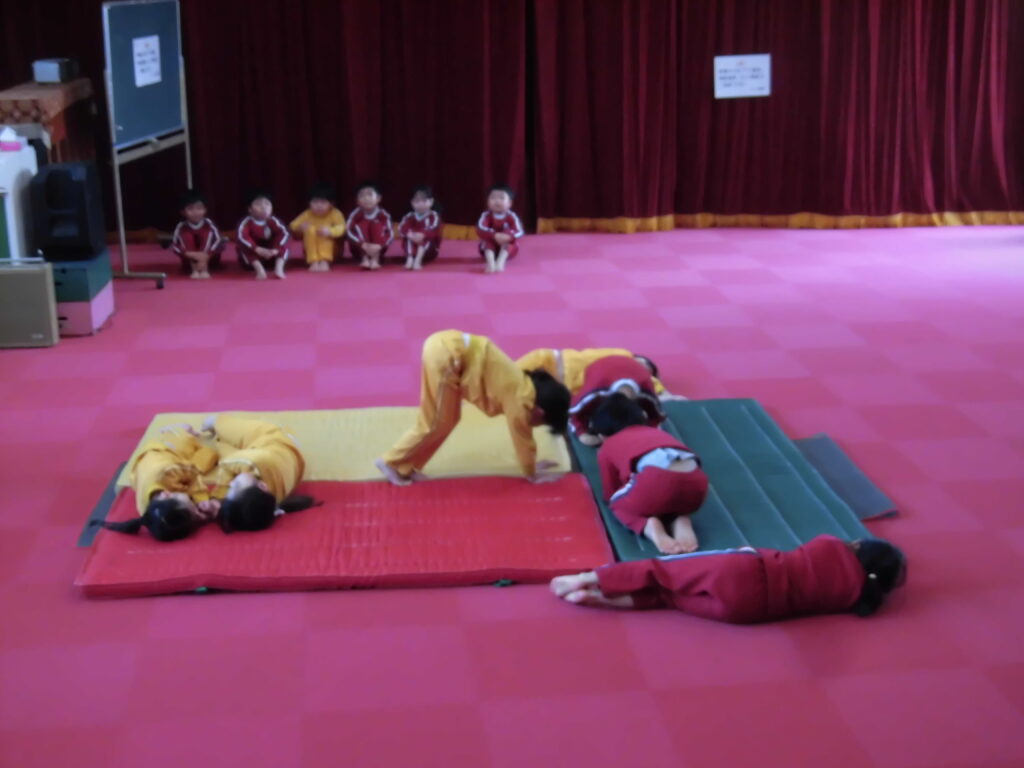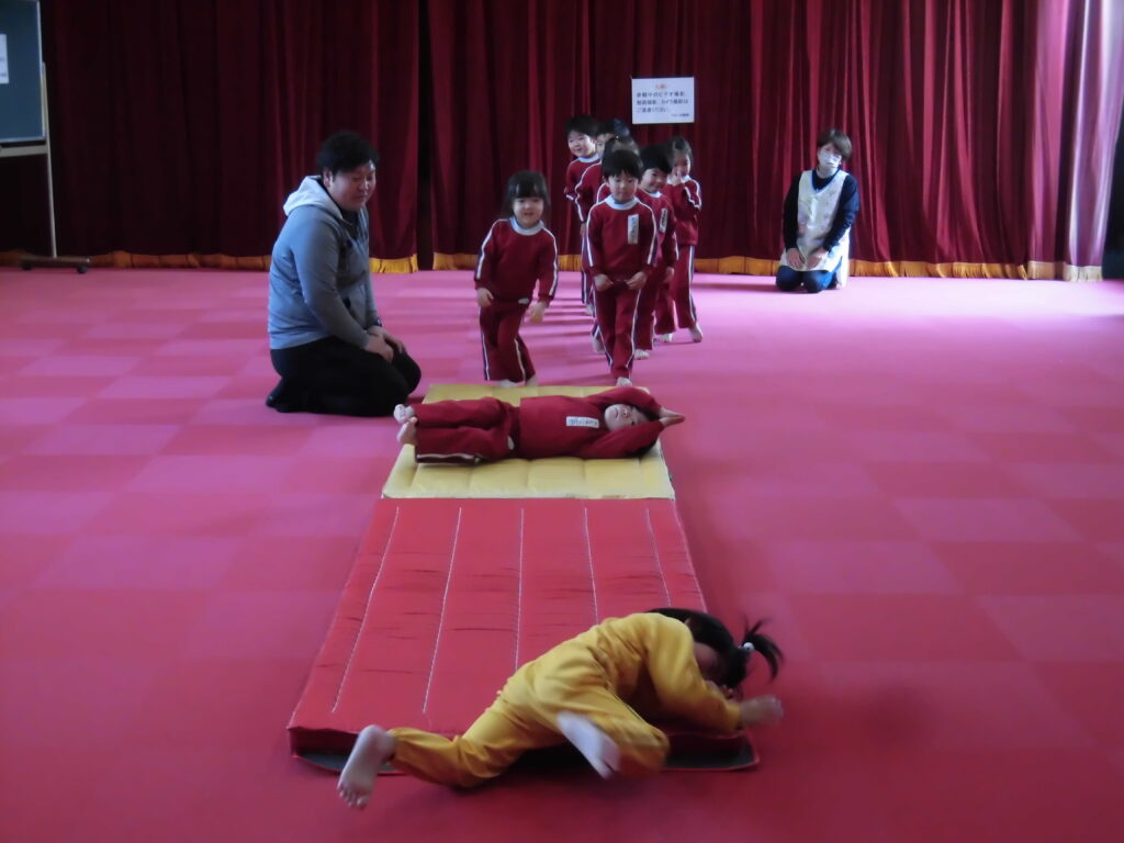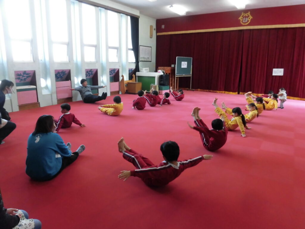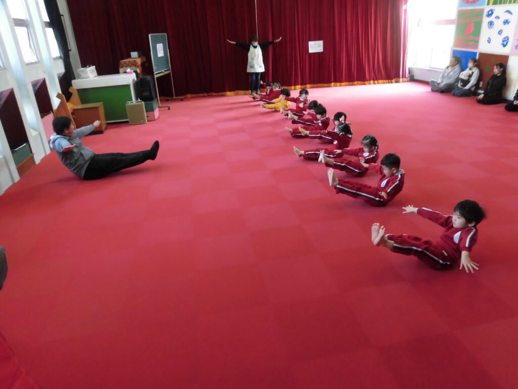 2月13日(金)今日は、「いむら体育教室」の活動を見ていただく保育参観がありました。月に2回程度行っている体育教室ですが、いろいろな動きができるようになってきました。講師の先生の指示で素早く動く子どもたちの姿に成長を感じます。今日は保護者の皆さんの前ということもあって、いつも以上に張り切って柔軟な動きやマットを使った動きなどを頑張っていました。